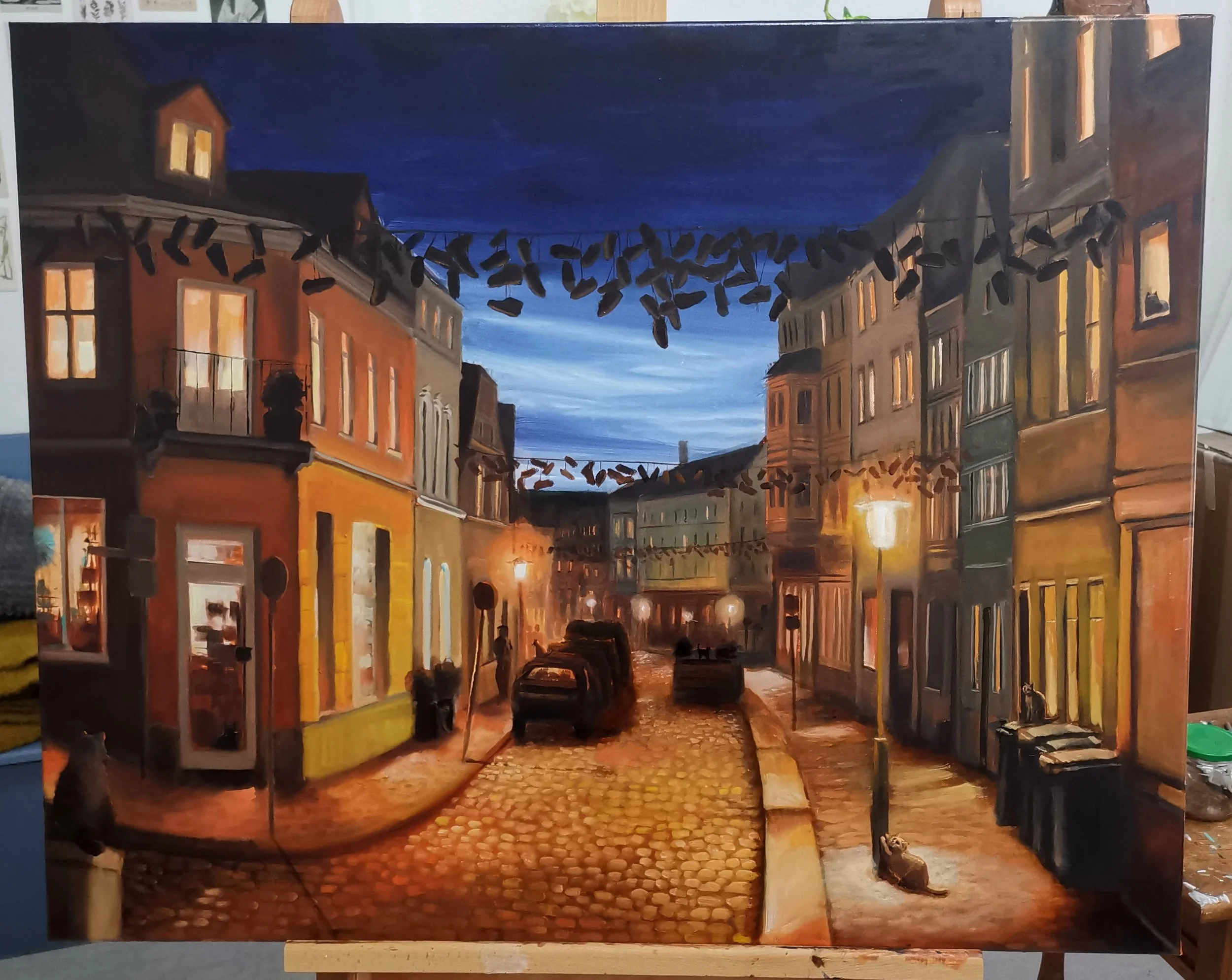 Darüber hinaus umfasst meine künstlerische Arbeit Malerei, die sich mit urbanen Räumen, besonderen Lichtverhältnissen und atmosphärischen Momenten beschäftigt.