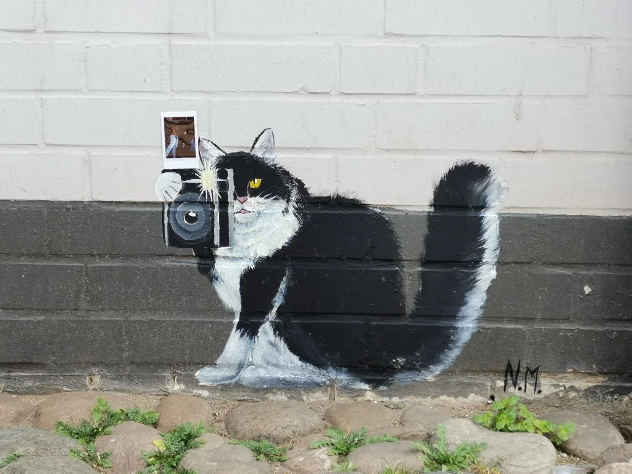 Ein buschiger, schwarz-weißer Kater schaut dich konzentriert an. Den Mund leicht geöffnet. Kein Zufall, denn dieser Kater ist der Fotograf unter den Katzen der Norderstraße. Ihm ist aufgefallen, dass ständig Menschen stehen bleiben, ihre Handys zücken und die Streetart-Katzen fotografieren. Da kam ihm die Idee: Warum nicht selbst mal zu Kamera greifen?