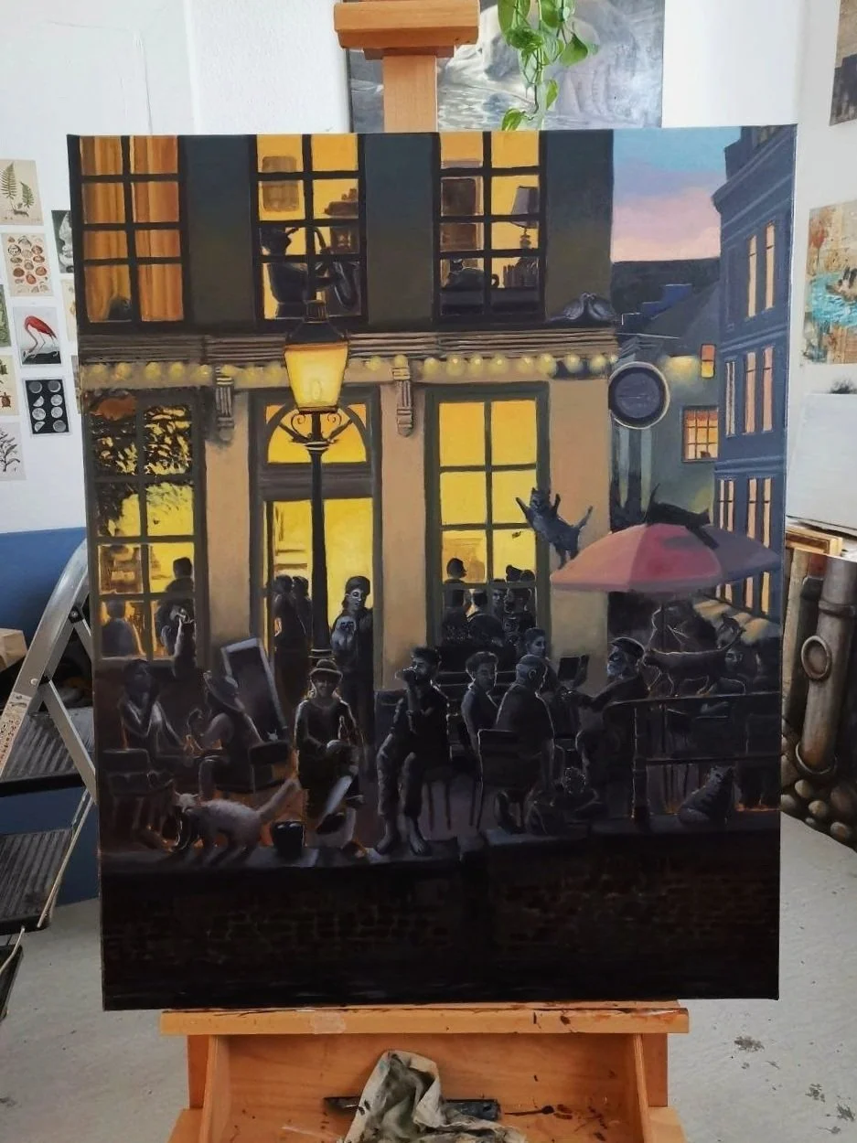Es ist ein Art Wimmelbild. In dem Bild verstecken sich eine Vielzahl von Katzen, die man später suchen muss. Für meine nächste Ausstellung plane ich eine ganze Reihe solcher Bilder, jede mit einer eigenen Szenerie und vielen kleinen Geschichten.