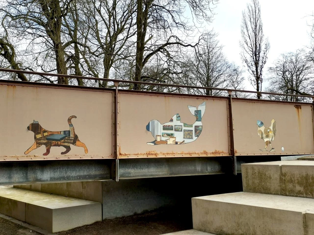 Ich habe mit hochpigmentierter Acrylfarbe gearbeitet, um eine langlebige und lichtechte Gestaltung zu gewährleisten. Auch wenn es kleine Details gibt, die ich bei perfektem Wetter noch feiner ausgearbeitet hätte, bin ich zufrieden: Die Silhouetten laden dazu ein, hinzusehen, zu entdecken und eine Verbindung zwischen Museum und Tieren zu ziehen.