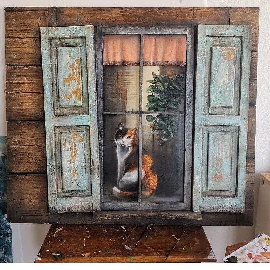 Mit Öl und Aquarell fange ich Licht und Schatten ein, spiele mit Tiefe und Atmosphäre. Und manchmal, wenn man genau hinsieht, verbirgt sich irgendwo eine Katze – still beobachtend, mitten im Moment.
